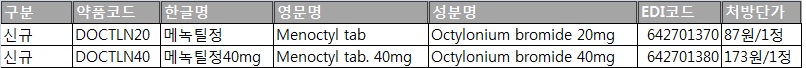 준긴급 신약 도입 안내 [메녹틸정20mg, 메녹틸정40mg] 등록일: 2018-10-05 페이지 정보 작성자 sejongph 댓글 0건 조회 1,771회 작성일 18-10-05 14:24 목록 본문 준긴급신약 도입으로 인해 다음 약들을 코드를 생성합니다. 따라서 이를 원외약국 게시판에 공고하오니, 조제 시 참고 부탁드립니다. 이전글긴급 신약 도입 안내 [다이펜탈크림20g(신경과), 마비렛정100/40mg(소화기내과)] 18.10.10 다음글2018년 약사위원회 통과 신약 코드 생성 및 입고 안내 (3차) (10월8일부터 처방-수정) 18.10.01 목록으로